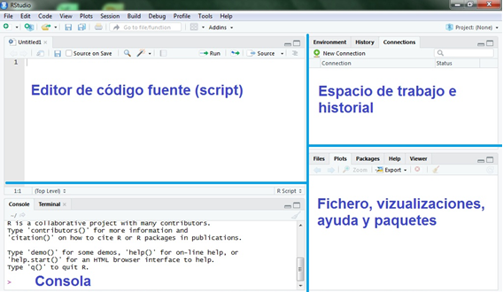 R Studio - Entorno de Desarrollo Integrado (IDE) es una interfaz de trabajo que fue desarrollada por la companía R Studio, la cuál nos permite utilizar todas las herramientas y potencialidades que tiene el software R en un entorno de trabajo más cómodo y productivo. Puede ver más características aquí. Una vez instalado el programa, al ejecutarlo se puede apreciar que en su interfaz presenta cuatro ventanas diferentes de visualización; las mismas son el editor de código fuente (script) y visor de datos, Espacio de trabajo e historial, Consola y Fichero, visualizaciones, ayuda y paquetes, tal como se puede ver en la Imagen 1 a continuación.