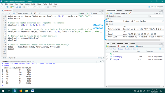 • Factor: este tipo de objeto se utiliza para almacenar datos de tipo categórico, los mismos pueden ser nominales u ordinales.